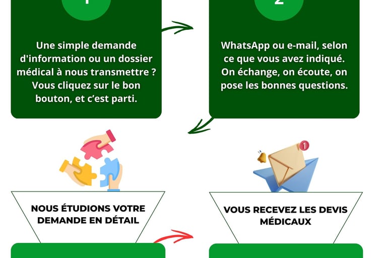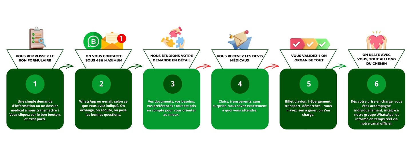 Derrière chaque demande se cache une histoire. Un espoir, une souffrance, un besoin urgent d’accompagnement. C’est en comprenant cela que nous avons imaginé une expérience sur mesure, pensée pour alléger les démarches, rassurer, guider et offrir bien plus qu’un simple service logistique. De la première prise de contact à la sortie de clinique, chaque étape est gérée avec soin, attention et professionnalisme.
