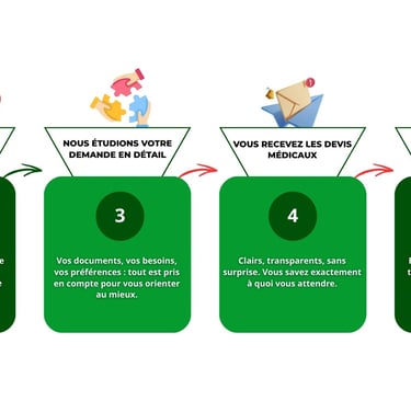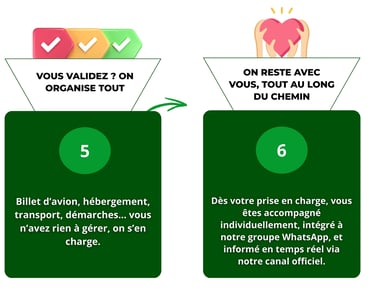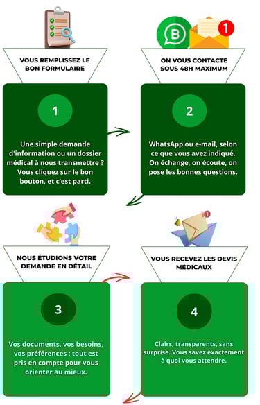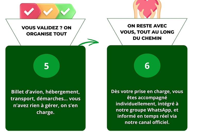 De votre premier message à votre arrivée au Maroc, chaque étape est pensée pour vous offrir un accompagnement personnalisé, rapide et rassurant. Suivez notre processus en 6 étapes, et laissez-nous prendre soin de tout.