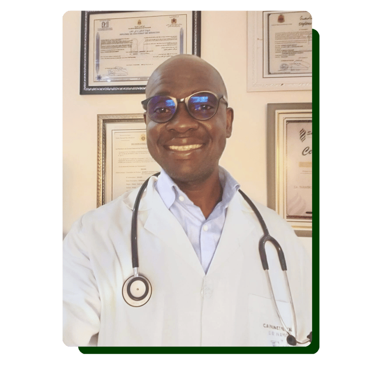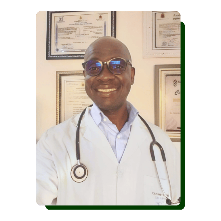 Le Dr NAMBOY Évrard accompagne les patients venant de l’Afrique (Congo, Gabon, Guinée, Mali, etc.). Il assure un suivi médical rigoureux et quotidien, en collaboration avec CHADESH et nos cliniques partenaires. Son objectif est de garantir une prise en charge optimale et de veiller à la continuité des soins tout au long du séjour médical.